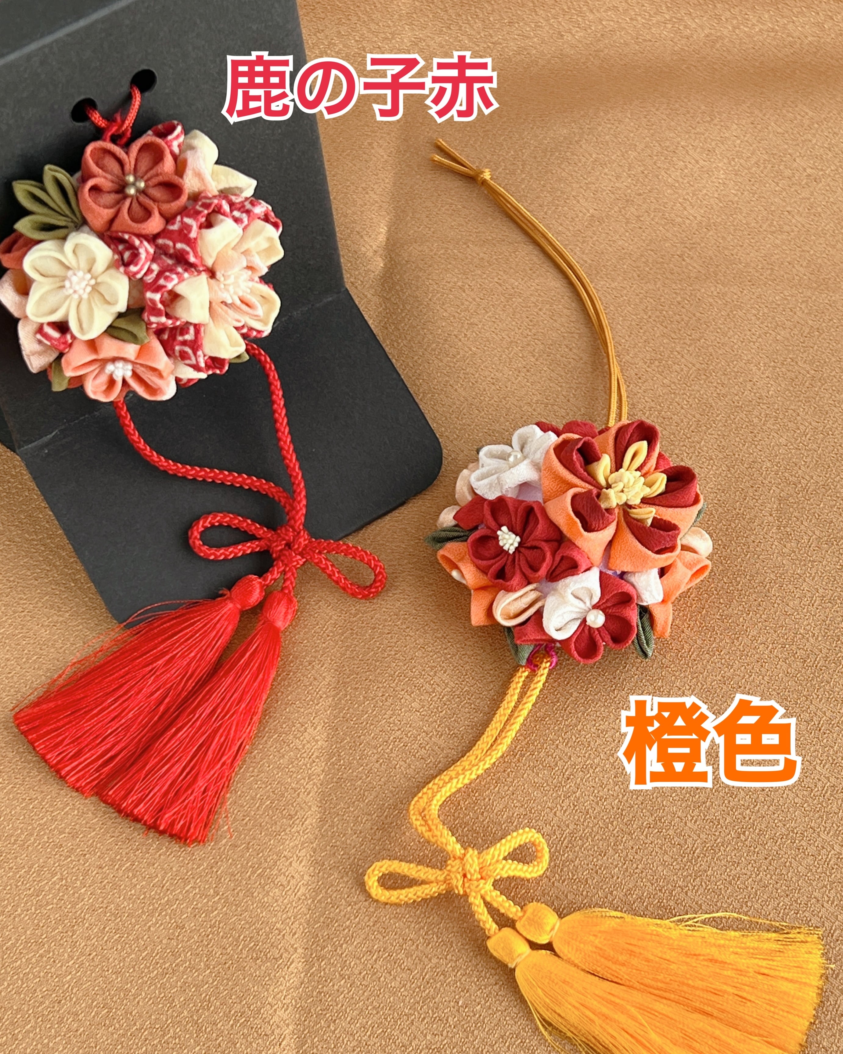 打紐下げ飾り(ピンク→紫/橙→山吹/鹿の子赤→赤)