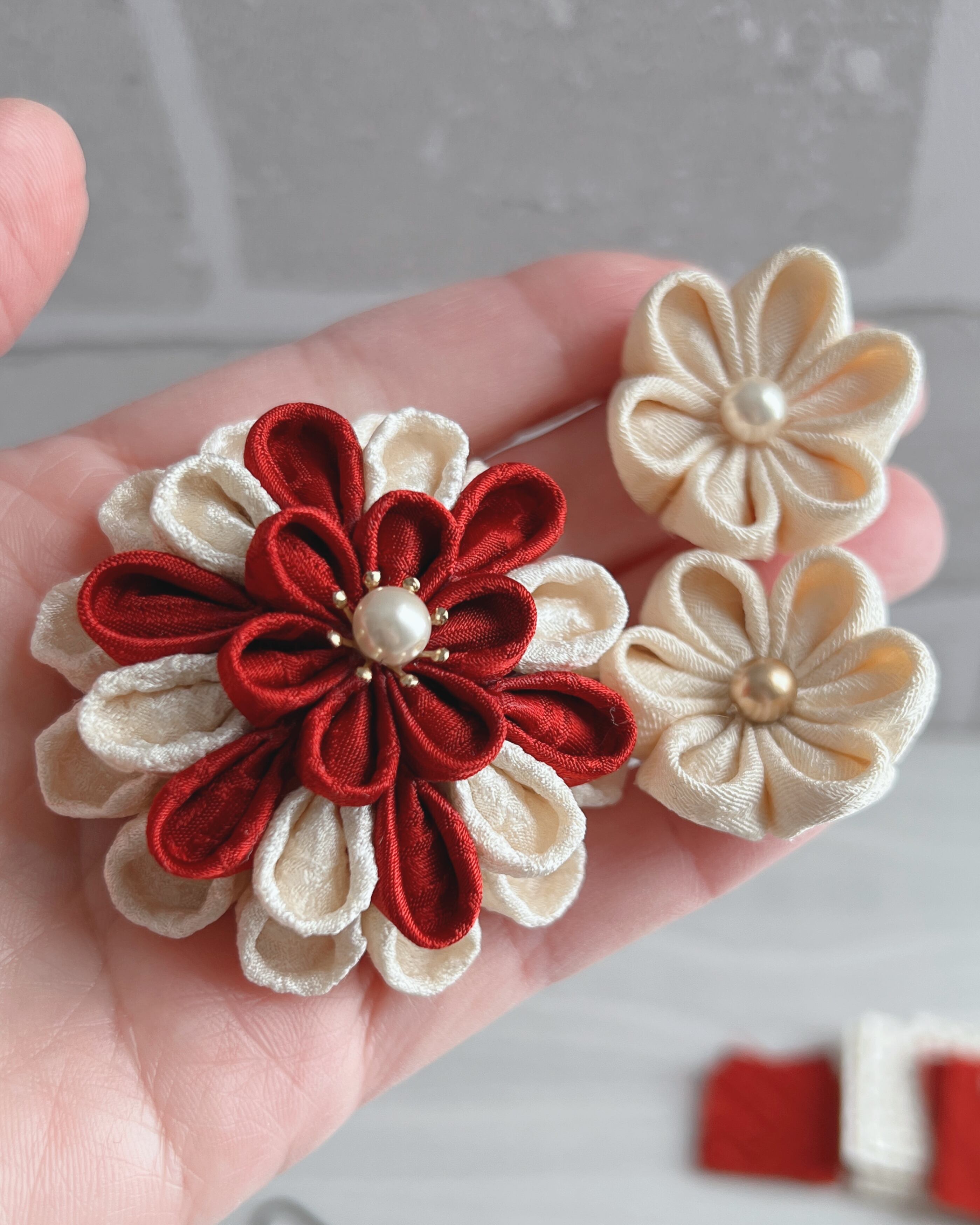 今人気の半くすポンポン菊デザインのお花をメインに、小花を二輪添えたつまみ細工初めての方にも作れるキットになっています